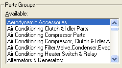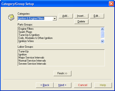 The Category/Group Select dialog box lets you manually select the labor or part groups and categories that LaserCat 3 uses. The dialog box displays when you finish selecting supplier coverages.