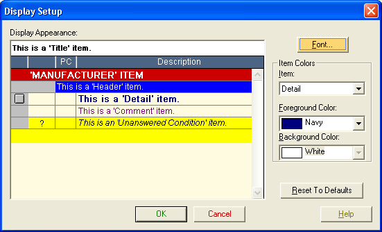 Use the Font button to open a dialog box allowing you to choose the font. Use the Item drop-down list to select the display item you want to customize. Use the Foreground Color drop-down list to select the text color for some of the items in the results table. The Background Color is not editable. Use the Reset to Defaults button to undo any changes you made.