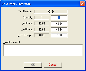 Use Post Parts Override to override the prices or quantities for an item. This dialog box opens when you click Edit in the Posted Items dialog box (the shopping cart). You can also open it by highlighting a part in the results window, then pressing <Shift + Enter>.