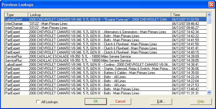 Use this dialog to repeat a lookup for a previous vehicle. This dialog displays a list of lookups from the previous five days.