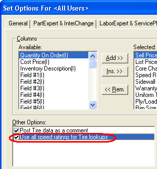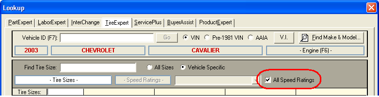 If this option is set, the default for tire lookups is to display all speed ratings in the results window. But you can still narrow your search to a single speed rating.