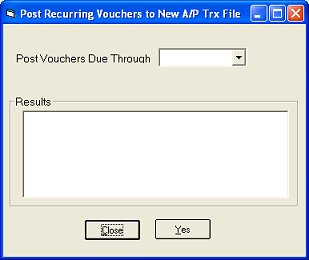If you have set up recurring A/P transactions, remember that you need to post recurring transactions every month by running the Post Recurring Vouchers To New A/P Trx File. Epicor Software Corporation™ suggests you post recurring transactions on the last day of every month.
