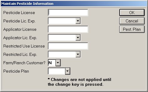 Click OK. The maintain dialog closes. Click Change. The pesticide license information is saved to the customer account.