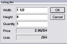 C = Cutting SKU. In POS, the system prompts you to enter the width and height of the SKU. An example of a cutting SKU is glass. You must enter any fractional measurement as a fraction (NOT a decimal), as shown here in the Width field: