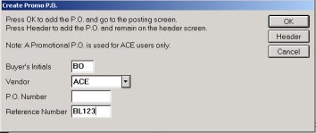 Type the Buyer's ID. At Vendor, enter your vendor code for Ace. At Reference #, type up to five alphanumeric characters. Click OK.