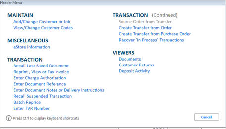 If the insertion point is in the Customer Area of the Posting Screen or anywhere in the Header Screen, and you press menu, then the following dialog box displays:
