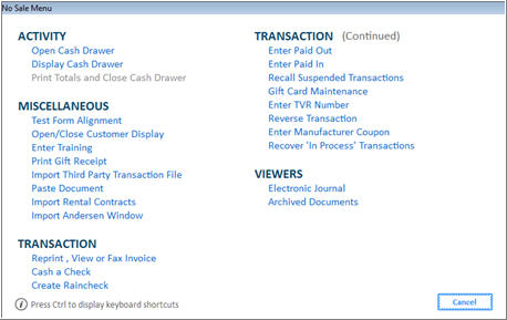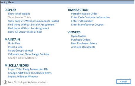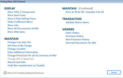 If you press menu to post an item in the Item (SKU) box, then the following dialog box displays: