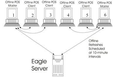 The Offline POS Master/Client setup allows POS stations to get their offline refresh data from another POS station rather than from the Eagle server in order to streamline the update process. This setup requires Windows 2000, XP, 2003, or higher.