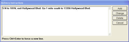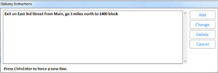 In the box that displays, enter the delivery instructions, using Control-Enter to start a new line of text if needed. When finished, click Add if adding new delivery instructions, or click Change if changing existing instructions. You can also press Delete to delete existing instructions.