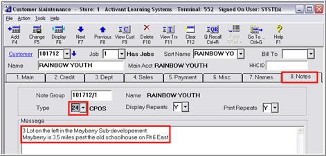 You can set up Delivery Instructions that print on all types of POS documents (Invoices, Credit Memos, Orders, Special Orders, Estimates, and invoiced Orders/Special Orders/Estimates) for customers in Customer Maintenance. These instructions print on the last page of documents, in the last lines of the body.
