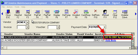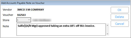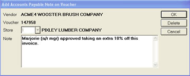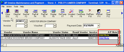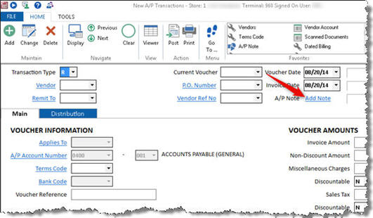 You can attach A/P Notes to Accounts Payable transactions from any of the following windows: New A/P Transactions (ATMU), the ATMU Grid Viewer (accessed by clicking the Viewer button), Posted A/P Transactions (AVIQ), or A/P Invoice Maintenance and Payment (APMU). You can use A/P Notes to record information about specific transactions in order to help you manage your A/P accounts. To add a note, you simply click the Add Note hyperlink and type your note. Once you have added a note to an A/P transaction, the hyperlink no longer says  "Add Note," but instead displays the date of the note and the user who entered it. This means that you can tell at a glance which transactions have a note, when the note was written, and who wrote it.
