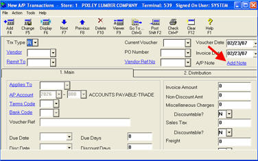 1. Display the appropriate transaction in one of the following A/P screens: New A/P Transactions (ATMU), Posted A/P Transactions (AVIQ) or AP Invoice Maintenance and Payment (APMU).