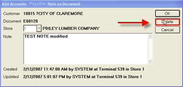 1. To delete a note, simply click the hyperlink showing the date and user (as shown in step 3 above), and click Delete in the dialog that displays.