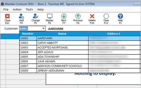 Use this procedure to set up customer-specific SKUs. For example, a particular commercial/industrial account has certain SKUs that they want to print on their invoices for the items they buy from you. In the Maintain Customer SKUs window, you link actual SKUs to the customer's SKUs.