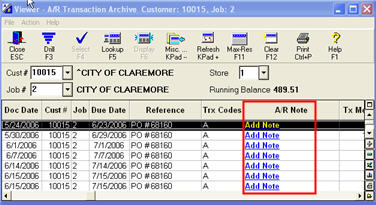 If you are adding a note in the A/R Transaction Viewer, click the Add Note hyperlink for the appropriate transaction in the A/R Note column, which is located in the grid (note: you may need to scroll to the right to see the A/R Note column).