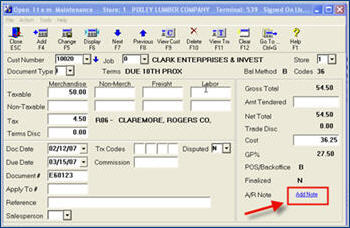 You can attach A/R Notes to Accounts Receivable transactions from any of the following windows: Open Item Maintenance (MOI), Received on Account (ROA), the A/R Transaction Viewer, or the A/R Archived Transactions Viewer. You can use A/R Notes to record information about specific transactions in order to help you manage your A/R accounts. To add a note, you simply click the Add Note hyperlink and type your note. As a result, the hyperlink no longer says "Add Note," but instead displays the date of the note and the user who entered it. This means that you can tell at a glance that a transaction has a note, when it was written, and who wrote it.