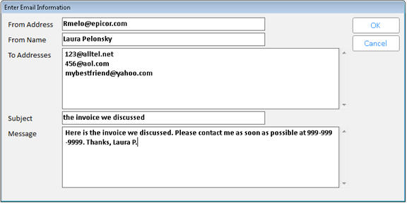 In the dialog box that displays, fill in the fields. You can enter up to 10 email addresses in the To Addresses field; enter one email address per line, pressing Control-Enter to start a new line. If you already set up email addresses in Customer Maintenance, those email addresses display automatically.