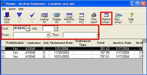 In the Archive Statement Viewer window, use the boxes at the top of the grid to specify which customer (and job, if applicable) you want to display. You can optionally select a date range in the From and Thru boxes. When finished filling in the boxes, click Refresh.