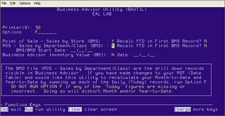 BMDPURGE purges from Business Advisor any existing sales information for the departments you marked as non-merchandise. You can run BMDPURGE any time— you do not need to wait until the end of the business day.