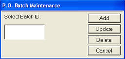 To update a batch, click Update from the PO Batch Maintenance dialog. When the Add PO Batch dialog displays, add or remove POs, as desired, and click OK. If you are ready to close PO Batch Maintenance, click Cancel.