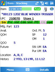 If you enter an SKU on the Eagle Mobile main menu, the screen you set up as the default screen displays. You can go to the Stocking screen by tapping Stocking. From there, you can display the other Eagle Mobile Inventory screens.