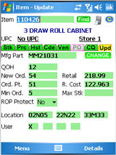 With the exception of the Price Check and Update screens, the various Eagle Mobile Inventory screens are abbreviated versions of the corresponding screens in Eagle for Windows. The item information that displays on your Eagle Mobile is actual live data from Inventory Maintenance.
