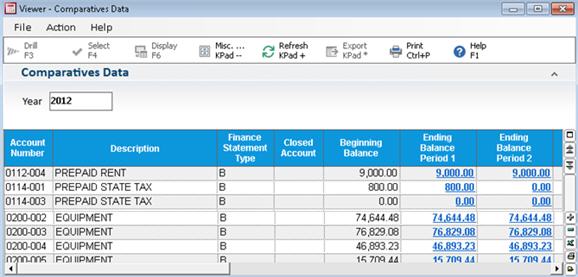 If you use third-party software to print your financial statements, use the following procedure to download General Ledger account information from the Comparatives Data Viewer to Excel. The Comparatives Data Viewer stores account information from both the current year and prior years.