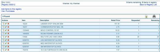 list of all the items from the registry that have been purchased will