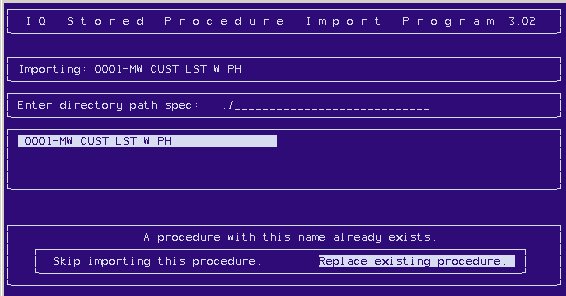 7. Press <End>. If a procedure already exists with the same name as the procedure you copied from the diskette, a message displays. Select the option to either skip the import or replace the procedure. The selected procedures are imported.