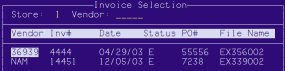 Press <Up/Down Arrow> to highlight the invoice you want to select and then press <Enter>. The selection box closes. The Vendor Code field and the Selected PO# to Reconcile field are automatically filled in.
