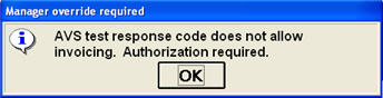 If the response code indicates that invoicing is not allowed (this can be due to AVS response codes, or because successful test results don't exist or have expired), press OK. At this point you must either obtain a manager's override, or perform a test transaction To display the AVS test window, press Total (+ on the keypad) to total the transaction, select T-Totals Menu, then select U-Address Verification Test. prior to invoicing.