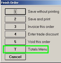 For Orders/Special Orders, total the transaction to display the Finish menu. From that menu, press T-Totals Menu