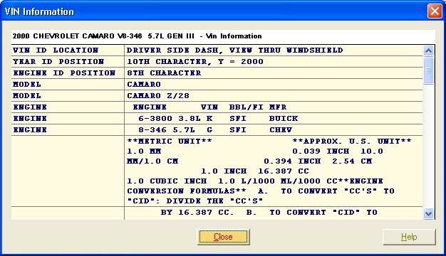 LaserCat 3 provides two types of VIN information. If you performed a lookup using a method other than using an actual VIN, you can press <F4> or press the V.I. Button on the Lookup window to see VIN information.