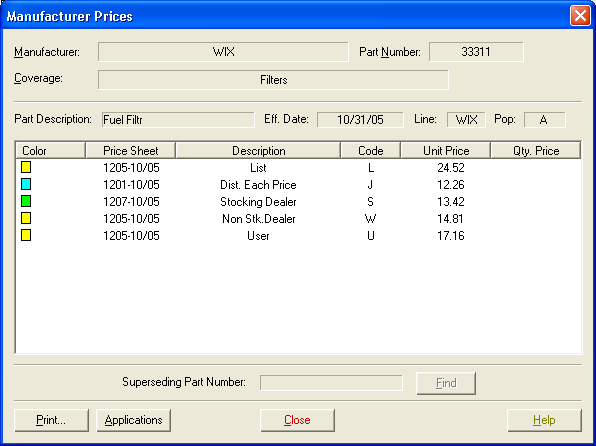If the part has been superseded, the new part number displays in the Superseding Part Number field. You can then click Find to look up prices for the new part.