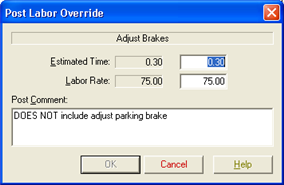 Either the Post Parts Override or the Post Labor Override dialog displays, depending on which catalog tab you are in.