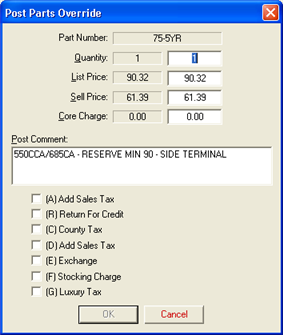 You can override the settings for any part or labor item either before or after posting the item to the shopping cart. Your changes affect only the item you're selling. They are not saved to the LaserCat 3 catalog.