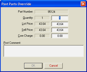 Use Post Parts Override to override the prices or quantities for an item. This dialog box opens when you click Edit in the Posted Items dialog box (the shopping cart). You can also open it by highlighting a part in the results window, then pressing <Shift + Enter>.