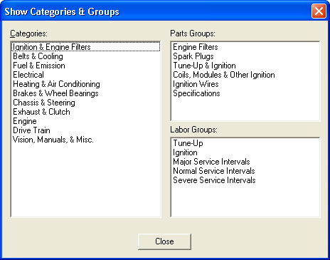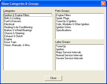 Displays lists of the categories, part groups, and labor groups that have been set up in the integrating application for specific jobs. The text boxes are not editable. |