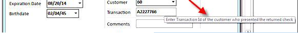 Fill in the fields. The required fields are Customer Name, Phone Number, Driver’s License, and Account (checking account number), but you should fill in as many fields as possible. For more information about a field, hover your cursor in that field and a definition displays. (Note: the Check # and ABA/Routing# fields are alphanumeric, and you can enter up to 12 digits in each field.)