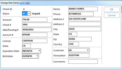 In the Change Bad Check List Record dialog, modify the desired fields, then click OK.