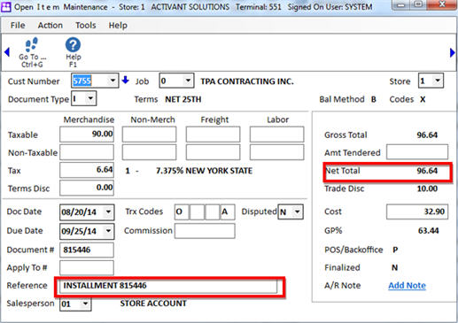 Note that the Reference field lists the installment number, and the Net Total is in the far right column. These fields can help you locate the correct Dated Billing document.