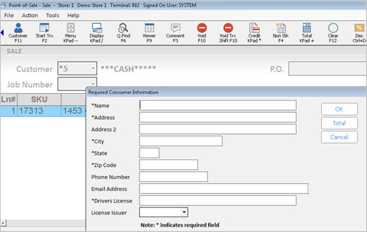 Depending on the type of consumer information you are collecting, the Required Consumer Information dialog displays either at the beginning of a transaction (i.e., before you start a saved transaction), or at the end of the transaction (i.e., if you are ringing up a transaction with items marked with a Consumer Info Code, and/or a transaction with a return, tax exemption, special tally item, or customer that requires information.