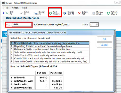 7— Sells With CreditType 7 "Sells With Credit" automatically posts the related item when you're creating a line-item credit for the parent SKU. Use type 7 if you assess a restocking fee whenever the parent item is returned as a line-item credit.