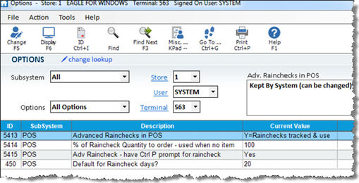 Click in the Current Value column of the option "Advanced Rainchecks in POS." Click the arrow that displays. Click Y - Rainchecks tracked and used in suggested ordering.
