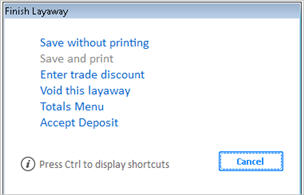 On the Finish Layaway menu, Save Without Printing is disabled when you create a Layaway because the customer needs a printed record of the transaction as an agreement on price, quantity sold, etc. when they make an additional or final payment. Save Without Printing is available when you recall the Layaway with option 4 (Review Layaway Item). Finally, when you recall a Layaway for an additional or final payment, the Finish Layaway menu is bypassed altogether, and the Totals menu displays.