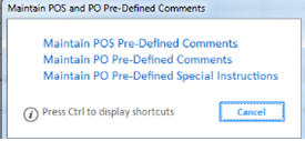 Use the following procedure to set up pre-defined comments or special instructions that you can select during PO posting using the F3 (Comment) button.
