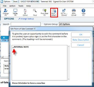 If you want certain comments to default to internal rather than external, set option 7730 "Non-printing (Internal) comment identifier" to ,, (two commas). Then in “Maintain POS Comments” (as shown above), prefix all comments you want to default to internal with the two commas.