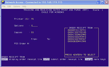 From Network Access at the Function prompt, type RRT and press Enter. The Tracking and Receiving Batch Print and Purge screen displays.