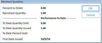 dialog box displays the quantity information for the item's raincheck(s).
