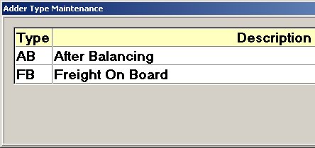 Maintain Purchase Order Adder Types. The Adder Type Maintenance dialog